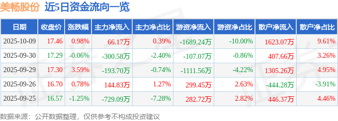 证券之星消息,截至2025年10月9日收盘,美畅股份(300861)报收于17.46元,上涨0.98%,换手率2.29%,成交量9.64万手,成交额1.69亿元。