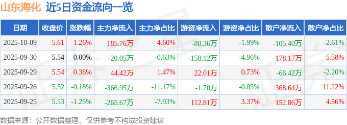证券之星消息,截至2025年10月9日收盘,山东海化(000822)报收于5.61元,上涨1.26%,换手率0.81%,成交量7.23万手,成交额4042.75万元。