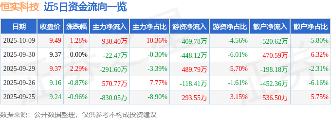 10月9日的资金流向数据方面,主力资金净流入930.4万元,占总成交额10.36%,游资资金净流出409.78万元,占总成交额4.56%,散户资金净流出520.62万元,占总成交额5.8%。