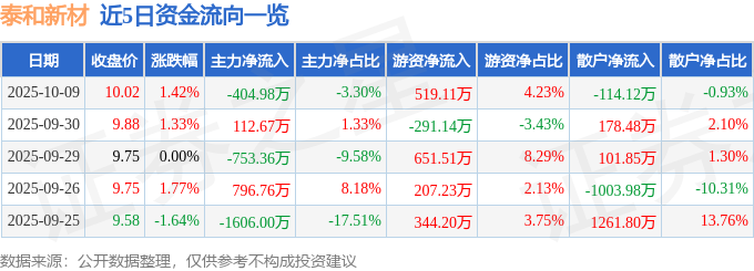 证券之星消息,截至2025年10月9日收盘,泰和新材(002254)报收于10.02元,上涨1.42%,换手率1.5%,成交量12.29万手,成交额1.23亿元。