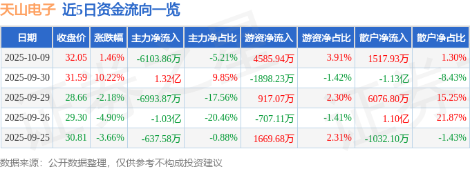 证券之星消息,截至2025年10月9日收盘,天山电子(301379)报收于32.05元,上涨1.46%,换手率28.11%,成交量35.8万手,成交额11.72亿元。