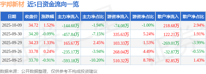 证券之星消息,截至2025年10月9日收盘,宇邦新材(301266)报收于34.72元,上涨1.52%,换手率2.07%,成交量2.15万手,成交额7443.87万元。