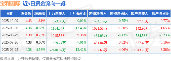 证券之星消息,截至2025年10月9日收盘,宝利国际(300135)报收于4.43元,上涨1.61%,换手率3.14%,成交量28.9万手,成交额1.26亿元。