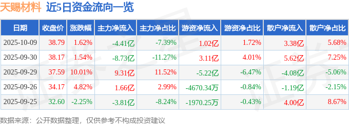 证券之星消息,截至2025年10月9日收盘,天赐材料(002709)报收于38.79元,上涨1.62%,换手率11.14%,成交量154.26万手,成交额59.64亿元。