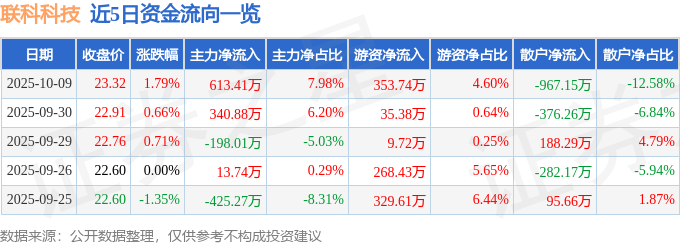 证券之星消息,截至2025年10月9日收盘,联科科技(001207)报收于23.32元,上涨1.79%,换手率1.68%,成交量3.32万手,成交额7688.14万元。