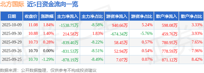 证券之星消息,截至2025年10月9日收盘,北方国际(000065)报收于11.08元,上涨1.84%,换手率1.68%,成交量16.34万手,成交额1.79亿元。