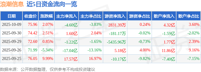 证券之星消息,截至2025年10月9日收盘,浪潮信息(000977)报收于75.96元,上涨2.07%,换手率10.46%,成交量153.85万手,成交额120.01亿元。