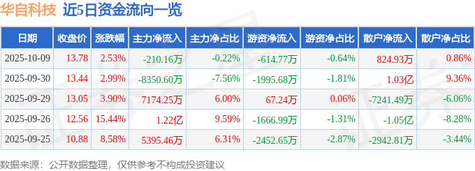 证券之星消息,截至2025年10月9日收盘,华自科技(300490)报收于13.78元,上涨2.53%,换手率17.42%,成交量68.52万手,成交额9.62亿元。