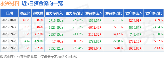 证券之星消息,截至2025年10月9日收盘,永兴材料(002756)报收于40.26元,上涨3.87%,换手率7.68%,成交量29.86万手,成交额11.91亿元。