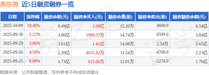 燕东微融资融券信息显示,融资方面,当日融资买入4.69亿元,融资偿还2.0亿元,融资净买入2.69亿元,净买入额两市排名第20,连续3日净买入累计4.29亿元。融券方面,融券卖出5100.0股,融券偿还500.0股,融券余量15.2万股,融券余额494.06万元。融资融券余额6.54亿元。