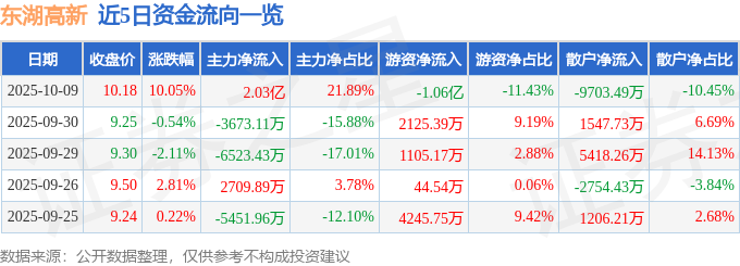 10月9日的资金流向数据方面,主力资金净流入2.03亿元,占总成交额21.89%,游资资金净流出1.06亿元,占总成交额11.43%,散户资金净流出9703.49万元,占总成交额10.45%。