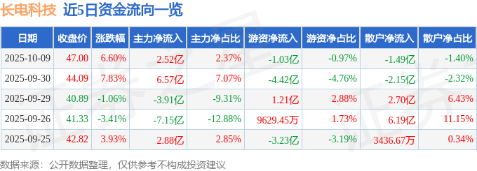 证券之星消息,截至2025年10月9日收盘,长电科技(600584)报收于47.0元,上涨6.6%,换手率12.87%,成交量230.26万手,成交额106.46亿元。