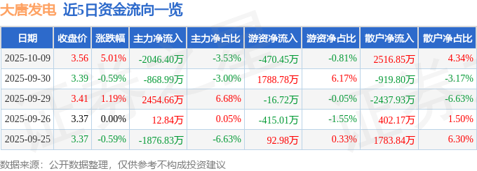证券之星消息,截至2025年10月9日收盘,大唐发电(601991)报收于3.56元,上涨5.01%,换手率1.33%,成交量165.35万手,成交额5.8亿元。