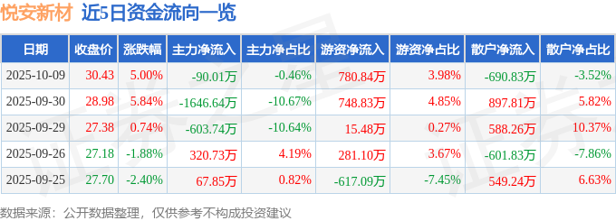证券之星消息,截至2025年10月9日收盘,悦安新材(688786)报收于30.43元,上涨5.0%,换手率4.47%,成交量6.43万手,成交额1.96亿元。