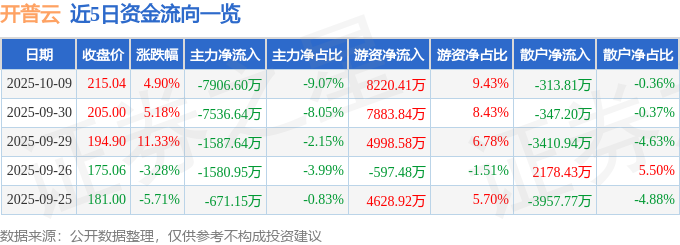 证券之星消息,截至2025年10月9日收盘,开普云(688228)报收于215.04元,上涨4.9%,换手率5.93%,成交量4.0万手,成交额8.72亿元。