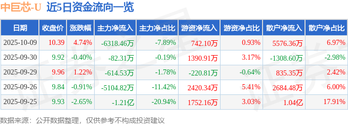 证券之星消息,截至2025年10月9日收盘,中巨芯(688549)报收于10.39元,上涨4.74%,换手率13.1%,成交量77.22万手,成交额8.0亿元。