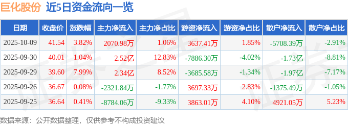 证券之星消息,截至2025年10月9日收盘,巨化股份(600160)报收于41.54元,上涨3.82%,换手率1.77%,成交量47.73万手,成交额19.62亿元。