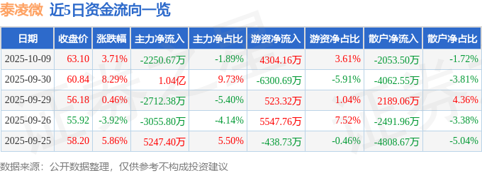 证券之星消息,截至2025年10月9日收盘,泰凌微(688591)报收于63.1元,上涨3.71%,换手率11.48%,成交量19.33万手,成交额11.91亿元。