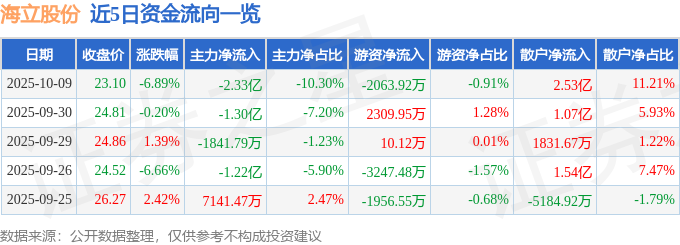 证券之星消息,截至2025年10月9日收盘,海立股份(600619)报收于23.1元,下跌6.89%,换手率12.33%,成交量97.34万手,成交额22.61亿元。