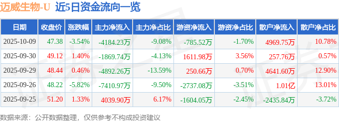 证券之星消息,截至2025年10月9日收盘,迈威生物(688062)报收于47.38元,下跌3.54%,换手率4.72%,成交量9.63万手,成交额4.61亿元。