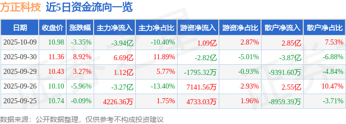 证券之星消息,截至2025年10月9日收盘,方正科技(600601)报收于10.98元,下跌3.35%,换手率8.23%,成交量343.05万手,成交额37.85亿元。