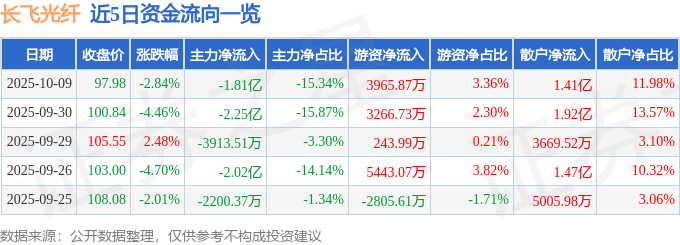 10月9日的资金流向数据方面,主力资金净流出1.81亿元,占总成交额15.34%,游资资金净流入3965.87万元,占总成交额3.36%,散户资金净流入1.41亿元,占总成交额11.98%。