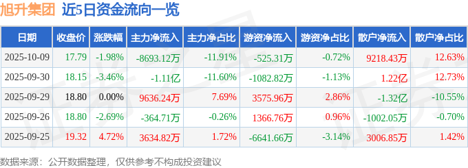 证券之星消息,截至2025年10月9日收盘,旭升集团(603305)报收于17.79元,下跌1.98%,换手率4.26%,成交量40.58万手,成交额7.3亿元。