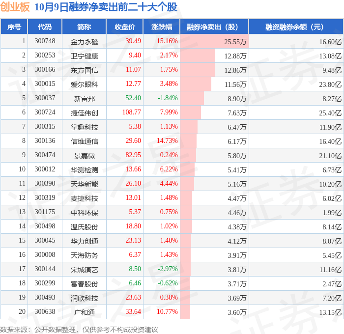 创业板融券净卖出前三分别为:金力永磁(300748)融券净卖出25.55万股、卫宁健康(300253)融券净卖出12.88万股、东方国信(300166)融券净卖出12.86万股,前20具体见下表: