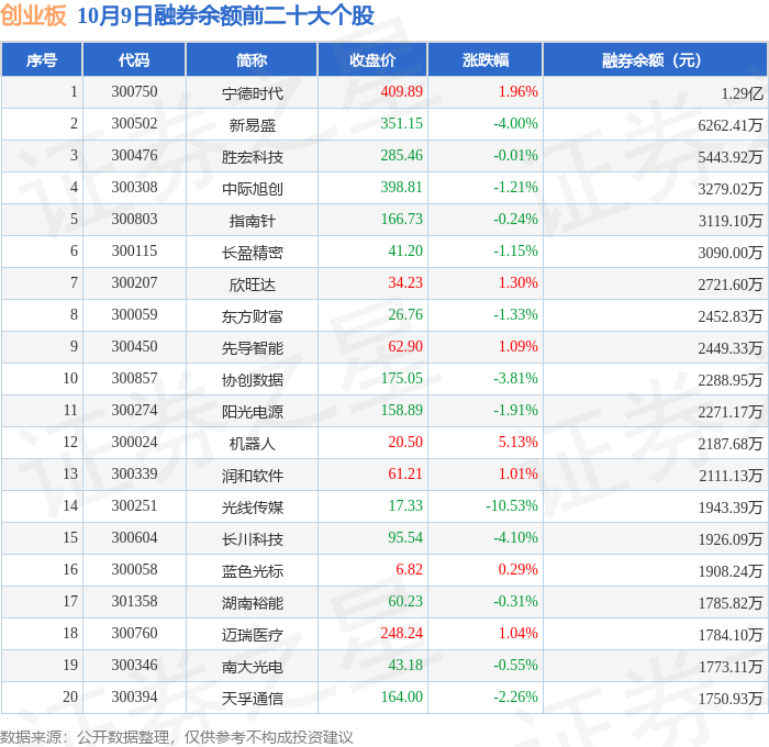 创业板融券余额前三分别为:宁德时代(300750)融券余额1.29亿元、新易盛(300502)融券余额6262.41万元、胜宏科技(300476)融券余额5443.92万元,前20具体见下表: