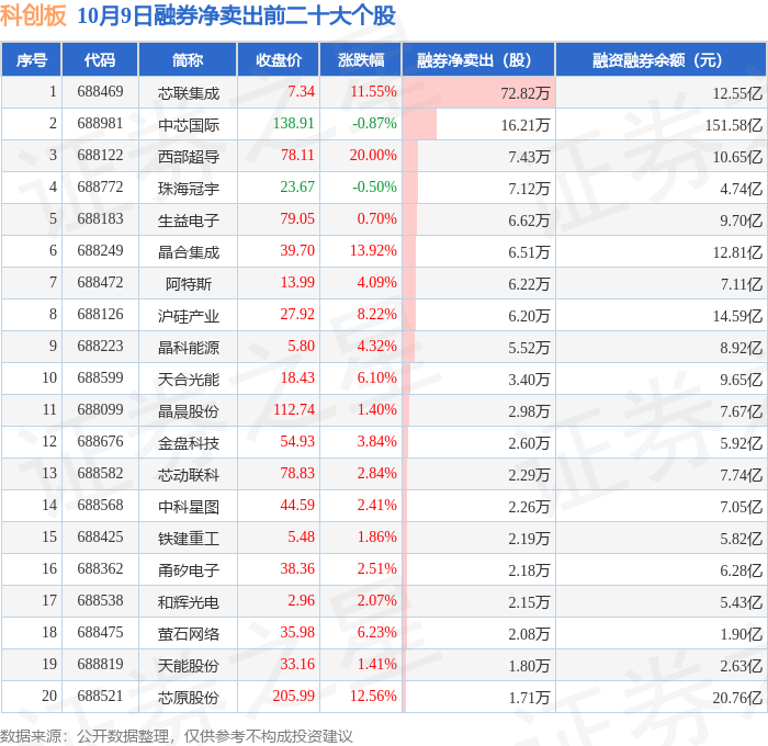 科创板融券净卖出前三分别为:芯联集成(688469)融券净卖出72.82万股、中芯国际(688981)融券净卖出16.21万股、西部超导(688122)融券净卖出7.43万股,前20具体见下表: