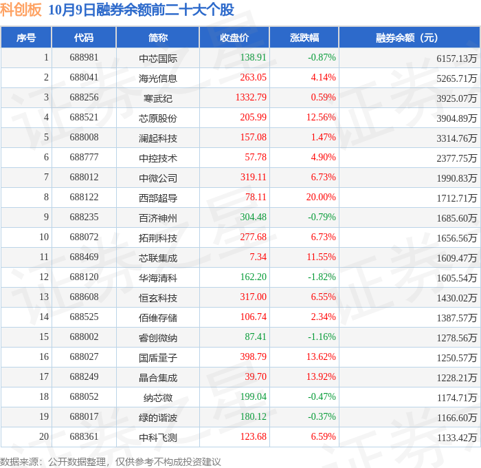 科创板融券余额前三分别为:中芯国际(688981)融券余额6157.13万元、海光信息(688041)融券余额5265.71万元、寒武纪(688256)融券余额3925.07万元,前20具体见下表: