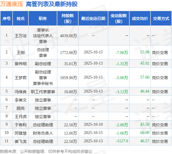 证券之星消息,根据10月10日市场公开信息、上市公司公告及交易所披露数据整理,万通液压(920839)最新董监高及相关人员股份变动情况:2025年10月9日公司董事,高级管理人员王刚、董事,高级管理人员景传明、董事,高级管理人员王梦君共减持公司股份9.28万股,占公司总股本为0.0779%。变动期间公司股价上涨4.4%,10月9日当日收盘报43.85元。