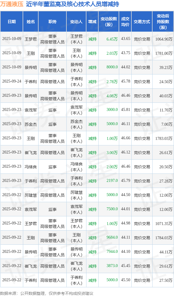 万通液压近半年内的董监高及核心技术人员增减持详情如下: