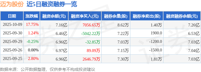 迈为股份融资融券信息显示,融资方面,当日融资买入2.94亿元,融资偿还2.24亿元,融资净买入7056.65万元。融券方面,融券卖出1.66万股,融券偿还2600.0股,融券余量8.62万股,融券余额1008.37万元。融资融券余额7.26亿元。