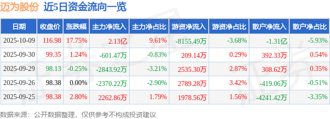 证券之星消息,截至2025年10月9日收盘,迈为股份(300751)报收于116.98元,上涨17.75%,换手率10.33%,成交量19.97万手,成交额22.15亿元。