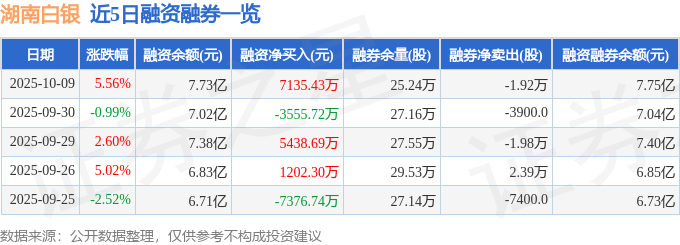 证券之星消息,截至2025年10月9日收盘,湖南白银(002716)报收于7.41元,上涨5.56%,换手率13.48%,成交量295.54万手,成交额21.72亿元。