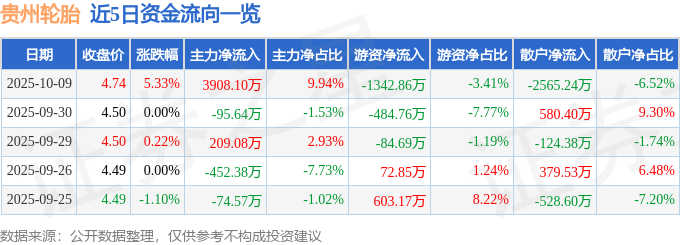 证券之星消息,截至2025年10月9日收盘,贵州轮胎(000589)报收于4.74元,上涨5.33%,换手率5.44%,成交量83.63万手,成交额3.93亿元。