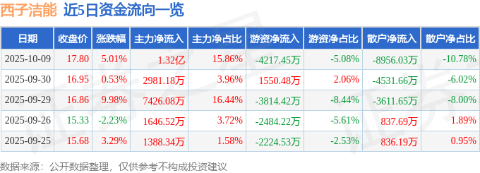 证券之星消息,截至2025年10月9日收盘,西子洁能(002534)报收于17.8元,上涨5.01%,换手率5.64%,成交量46.54万手,成交额8.31亿元。
