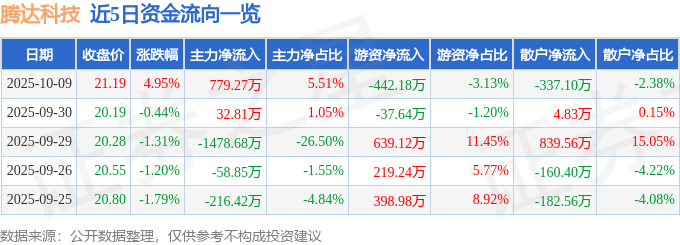 证券之星消息,截至2025年10月9日收盘,腾达科技(001379)报收于21.19元,上涨4.95%,换手率9.93%,成交量6.69万手,成交额1.41亿元。