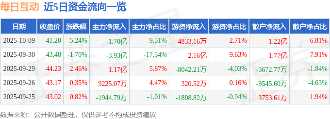 证券之星消息,截至2025年10月9日收盘,每日互动(300766)报收于41.2元,下跌5.24%,换手率12.04%,成交量43.13万手,成交额17.87亿元。