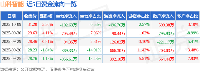 证券之星消息,截至2025年10月9日收盘,山科智能(300897)报收于31.2元,上涨5.3%,换手率7.1%,成交量6.21万手,成交额1.93亿元。
