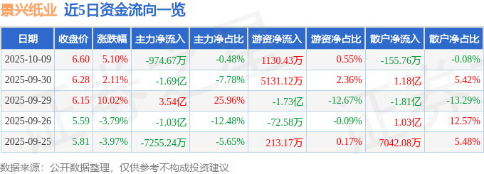 证券之星消息,截至2025年10月9日收盘,景兴纸业(002067)报收于6.6元,上涨5.1%,换手率25.69%,成交量318.93万手,成交额20.38亿元。
