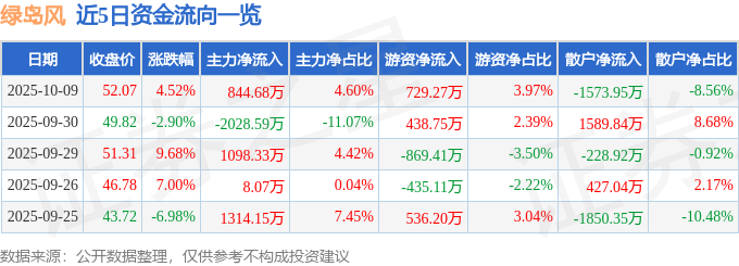 证券之星消息,截至2025年10月9日收盘,绿岛风(301043)报收于52.07元,上涨4.52%,换手率6.38%,成交量3.62万手,成交额1.84亿元。