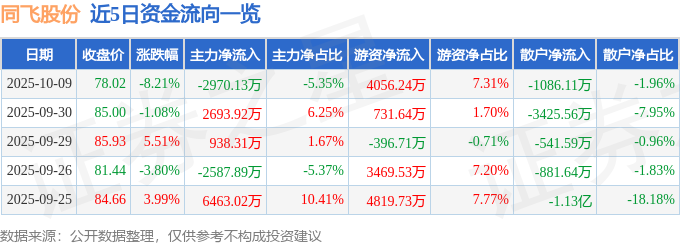 证券之星消息,截至2025年10月9日收盘,同飞股份(300990)报收于78.02元,下跌8.21%,换手率8.87%,成交量6.89万手,成交额5.55亿元。