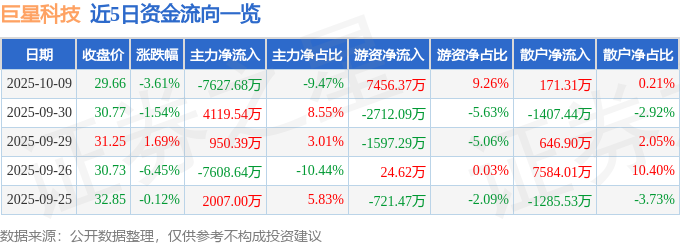 证券之星消息,截至2025年10月9日收盘,巨星科技(002444)报收于29.66元,下跌3.61%,换手率2.37%,成交量27.23万手,成交额8.05亿元。