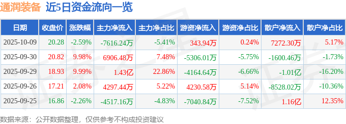 证券之星消息,截至2025年10月9日收盘,通润装备(002150)报收于20.28元,下跌2.59%,换手率19.05%,成交量68.3万手,成交额14.07亿元。