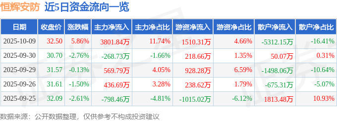 10月9日的资金流向数据方面,主力资金净流入3801.84万元,占总成交额11.74%,游资资金净流入1510.31万元,占总成交额4.66%,散户资金净流出5312.15万元,占总成交额16.41%。
