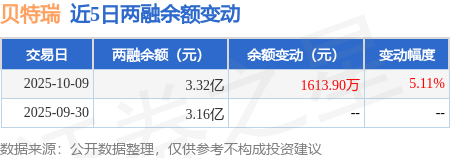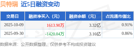 证券之星消息,10月9日,贝特瑞(920185)融资买入5188.38万元,融资偿还3574.48万元,融资净买入1613.9万元,融资余额3.32亿元。