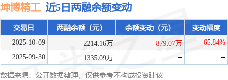 证券之星消息,10月9日,坤博精工(920570)融资买入1000.28万元,融资偿还121.21万元,融资净买入879.07万元,融资余额2214.16万元。