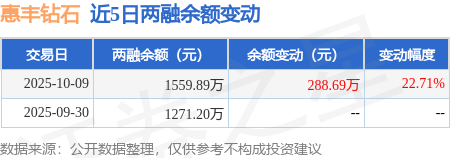证券之星消息,10月9日,惠丰钻石(920725)融资买入412.8万元,融资偿还124.1万元,融资净买入288.69万元,融资余额1559.89万元。